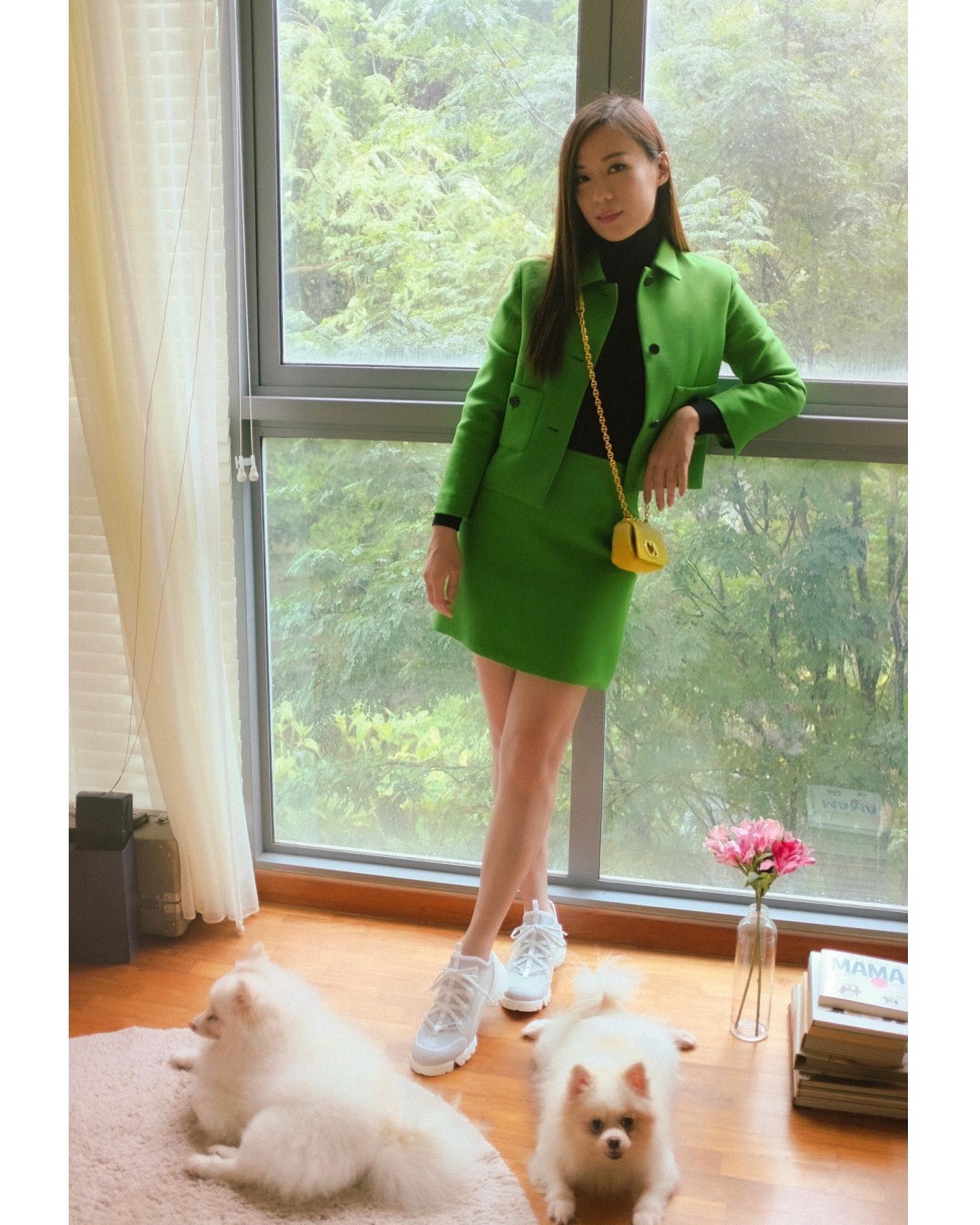 Rebecca in a green skirt and outer coat